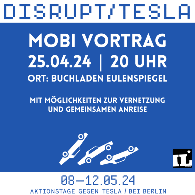 Um mehr über die Gründe und Hintergründe der Protesttage zu erfahren, kommt zum Mobivortrag und dann mit uns zu den Aktionstagen vom 8.-12. Mai nach Berlin: Block Tesla – Disrupt Elon